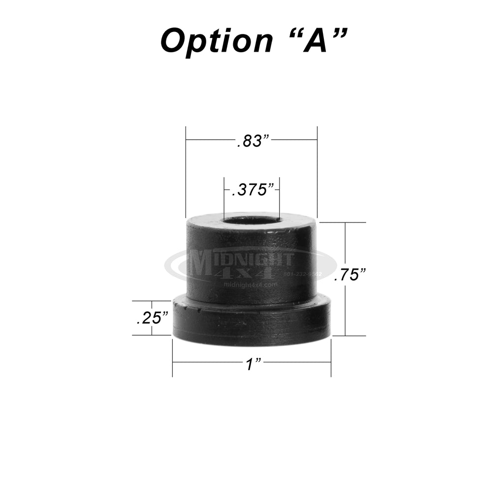 We offer a wide selection of universal polyurethane bushings for all your needs such as motor mounts, crossmembers, transmission mounts, links, etc. Please refer to the photos for bushing dimensions. Sold each.